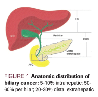Biliary cancers are a heterogeneous group of tumors that originate from the epithelial lining cells of the small ducts within the liver and the main ducts of the biliary system extending into the gallbladder. Included under this designation are the cancers of gallbladder, intrahepatic and extrahepatic bile ducts, and variably, ampullary carcinoma. Extrahepatic ductal tumors are further divided into lesions that arise at the liver hilum, or at the extrahepatic ductal system. Inconsistent use of designations based on anatomical characteristics such as intrahepatic/extrahepatic or hilar has confounded the analysis of epidemiological trends of this cancer. The true incidence of biliary cancers is unknown due to the difficulty in establishing an accurate diagnosis. The incidence of cholangiocarcinoma in the western world is between 0.35 to 2 per 100,000 per year.[1] However, in China and Thailand, the incidence can be up to 40 times the rate observed in the western world in part due to liver fluke (ie, Opisthorchis viverrini) infestation.[2] Over the past 30 years the incidence of intrahepatic cholangiocarcinoma in the western world seems to be rising with an increase from 0.1 per 100,000 to 0.6 per 100,000 while the incidence of gallbladder cancer is on the decline.[3-7] This year, it is estimated that there will be 12,360 new cases of biliary cancer in the United States with 3,960 deaths.[8] About 50-60% of cholangiocarcinomas emerge in the bile ducts of the perihilar region; 20-30% emerge in the distal extrahepatic region; and 5- 10% emerge in the intrahepatic region.[9-11] (Figure 1).