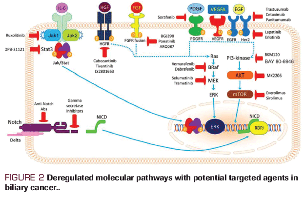 FIGURE 2: Deregulated molecular pathways with potential targeted agents in biliary cancer..