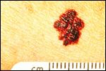 Seen is melanoma with a border that is uneven, ragged, or notched. Part of the ABCDs for detection of melanoma.