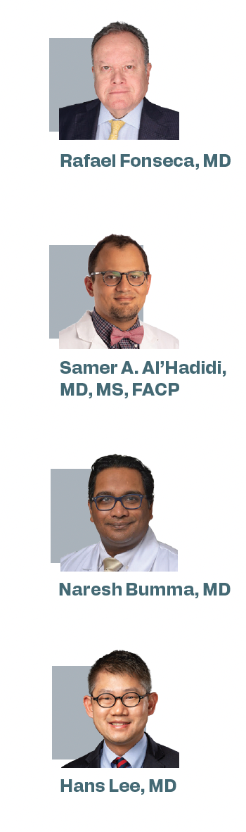 The conversation was moderated by Rafael Fonseca, MD, director for innovation and transformational relationships at Mayo Clinic in Phoenix, Arizona. He was joined by Samer A. Al’Hadidi, MD, MS, FACP, assistant professor of medicine at the University of Arkansas for Medical Sciences at Little Rock; Naresh Bumma, MD, a hematologist at The James Outpatient Care at The Ohio State University Comprehensive Cancer Center in Columbus; and Hans Lee, MD, associate professor in the Department of Lymphoma/Myeloma in the Division of Cancer Medicine at The University of Texas MD Anderson Cancer Center in Houston. The panel discussed various trials with the use of bispecific antibodies, how they will fit into the multiple myeloma space, and where they are headed in the future.