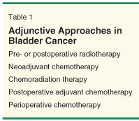Table 1 lists the varied options considered as adjunctive therapy in this patient population. These approaches involve multimodality care utilizing both local and systemic therapy. The rationale behind the use of neoadjuvant therapy prior to either surgery or radiation is to target micrometastatic disease that may be present at the time of diagnosis. Neoadjuvant chemotherapy is intended for patients with operable clinical stage T2–T4a muscle-invasive disease. As has been adequately described in the review, neoadjuvant therapy holds several benefits. It allows assessment of tumor response, and complete pathologic response may be used as a surrogate marker for overall survival.[3]