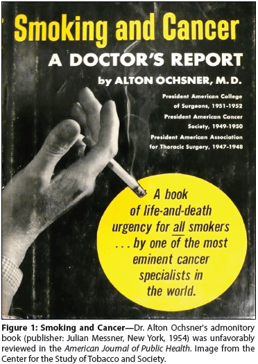 In fact, robust research warning against the dangers of smoking had been available 25 years earlier. In 1939, a review of the relationship between smoking and lung cancer-a comprehensive study with more than 400 references-was published by Ochsner and DeBakey. They had observed for several years that their patients with this once-rare condition had all started smoking as soldiers during World War I, when they had been given cartons of cigarettes by the Red Cross and other health organizations. Yet Dr. Ochsner’s vocal anti-smoking advocacy in the 1940s was met with indifference or derision by fellow physicians, more than two-thirds of whom smoked. His 1954 book, Smoking and Cancer: A Doctor’s Report (Figure 1), was negatively described in the March 1955 issue of the American Journal of Public Health, with the reviewer opining that, while “written...by an outstanding surgeon,” the causal relationship between cigarettes and cancer “is not proved,” adding, “This reviewer plans to place this book in the nonscience section of his library.”