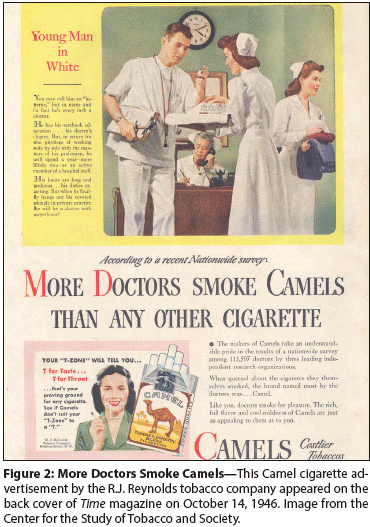Epidemiologic studies by Hill and Doll in the United Kingdom and Wynder and Graham, Levin, and Hammond and Horn in the United States in the late 1940s and early 1950s elucidated the causal role of cigarette smoking in lung cancer. Dancing around this evidence, tobacco companies competed to promote the “safest” cigarette brands. R.J. Reynolds claimed in certain advertisements that “more doctors smoked camels” (Figure 2). P. Lorillard created the Micronite filter for Kent that was made of an unnamed substance “so safe, so pure, it’s used to filter the air in many hospitals.” That substance was asbestos.