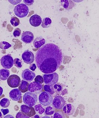 A small, hypolobated megakaryocyte in a bone marrow aspirate, typical of CML; source: Difu Wu, Wikimedia Commons