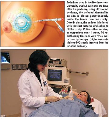 The retrospective study included 35 women who underwent ultrasound-guided partial breast brachytherapy between 2002 and 2006 (see figures). The researchers showed that placement of the MammoSite balloon catheter could be done from 7 to 47 days after lumpectomy. Ultrasound-guided partial breast brachytherapy also markedly reduced the time required for postoperative radiation therapy. Partial breast brachytherapy was completed in 5 to 7 days, 5 weeks less than the conventional course of whole breast radiation therapy.