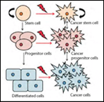 Once CSCs have been triggered to emerge, they respond to external stimuli, proliferate, and recapitulate the original histomorphology of the tumor. CSCs, depending on the tissue of origin, express the same markers (eg, CD34 and CD133) and intracellular proteins (eg, ALDH, Nanog, Sox2, and Oct3/4) found in normal stem cells of the same tissue.[14,15] For this reason, many have postulated that CSCs are transformed normal stem cells. Normal stem cells exist in a wide spectrum of differentiated states, ranging from primitive pluripotent cells to partially committed progenitor cells to fully committed and differentiated cells. At any point in this range of commitment states, a neoplastic genetic lesion can occur during cell division. Such an occurrence induces a tumor with a phenotype that is frozen in the differentiated state of the original stem cell or progenitor cell that sustained the genetic carcinogenic hit.[16]
