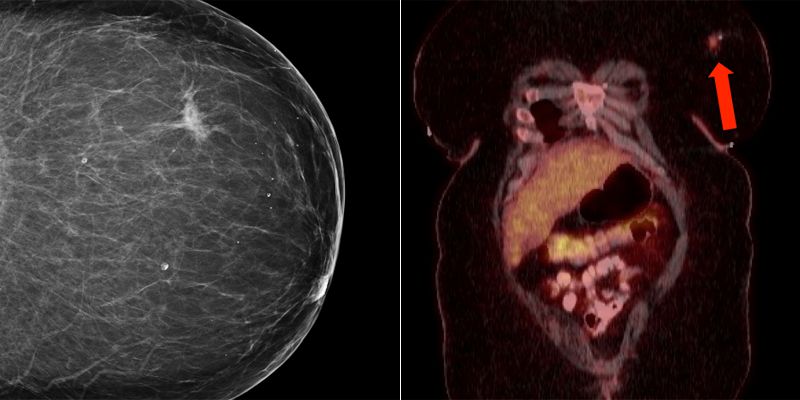 A staging PET/CT was obtained, which was unremarkable except for the known lesion in the left breast.