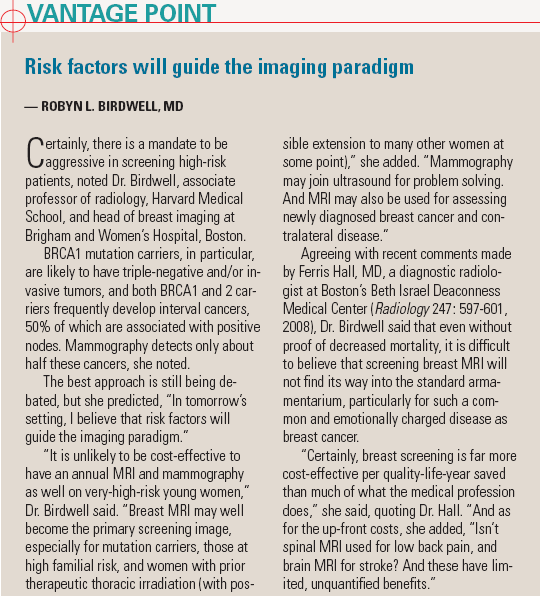 Finally, research out of the University of Pennsylvania in Philadelphia indicated that a staggered imaging protocol that rotates MRI with mammography was particularly useful in BRCA1/2 mutation carriers.
