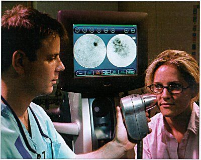 The SIAscope uses light and sophisticated computer software to construct an image of each part of the skin. The technique shows when a mole is invading deeper into the skin than normal, allowing early diagnosis of malignant melanoma. The SIAscope, based on spectrophotometric intracutaneous analysis (SIA), was researched at Birmingham University and developed by Cambridge-based Astron Clinica. It is in clinical trials at various sites in the United Kingdom. Dr. Marc Moncrieff (pictured, left) is one of the doctors conducting the trials.