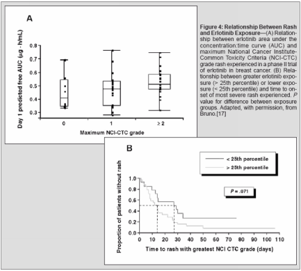 Correlation of Rash WithPharmacokinetic ParametersLimited available data suggest apotential correlation between rashand increased erlotinib exposure.Data from a phase II trial of erlotinibmonotherapy in patients withbreast cancer suggest a correlationbetween erlotinib area under theconcentration:time curve and maximumseverity of rash experienced(Figure 4).[16] There was a strongtrend toward reduced time to most severerash experienced in patients withdrug exposure above the 25th percentilecompared with those with lower