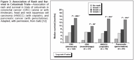 Saltz L, Kies M, Abbruzzese JL, et al: Thepresence and intensity of the cetuximab-inducedacne-like rash predicts increased survival in studiesacross multiple malignancies (abstract 817). ProcAm Soc Clin Oncol 22;204, 2003.