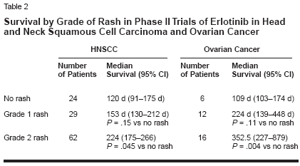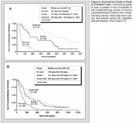 Rash is a class effect of HER1/epidermal growth factor receptor(EGFR)-targeted agents, and has occurred with high frequency and ina dose-dependent manner in clinical trials of these agents in cancerpatients. Analysis of phase II trials of erlotinib (Tarceva) in non–smallcelllung cancer, head and neck cancer, and ovarian cancer shows asignificant association between rash severity and objective tumor response.Rash severity was highly significantly associated with survivalin patients with non–small-cell lung cancer receiving erlotinib; mediansurvival in patients with no rash was 46.5 days, compared with257 days in those with grade 1 rash (P < .0001) and 597 days in thosewith grade 2/3 rash (P < .0001). Similarly, for the combined non–smallcelllung cancer, head and neck cancer, and ovarian cancer studies,median survival in patients with no rash was 103 days, compared with191 days in those with grade 1 rash (P = .0001) and 266 days in thosewith grade 2/3/4 rash (P = .0001). Similar findings have been madewith cetuximab (Erbitux) and in some settings with gefitinib (Iressa).The strong association of rash severity with response/survival suggeststhat rash may serve as a marker of response to erlotinib treatment andmay be used to guide treatment to obtain optimal response. Dosingerlotinib at the maximum tolerated dose, which is associated with morefrequent and more severe rash, may improve response rates and survivaldurations. Further study of the potentially important associationbetween rash and outcome of treatment with EGFR-targeted agents isneeded.