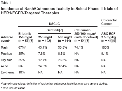 sociated with HER1/EGFR inhibitionis that this inhibition results in follicularocclusion due to lack of differentiationin the epithelium and affectssebaceous glands to produce a rosacea-like reaction, resulting in increasedproduction of inflammatorymediators and inflammation.The cutaneous toxicity associatedwith HER1/EGFR inhibition in preclinicalstudies is manifest primarilyas an acneiform skin rash in the clinicalsetting, with other skin disordersincluding pruritus, dry skin, anderythema. The skin rash is a class-relatedeffect, having been observed withall HER1/EGFR tyrosine kinase inhibitors(eg, erlotinib, gefitinib[Iressa]), dual HER inhibitors (eg,GW2016, and pan-HER inhibitors(eg, CI-1033), as well as with HER1/EGFR-specific monoclonal antibodies(eg, cetuximab [Erbitux], ABX-EGF,EMD72000). Table 1 provides an exampleof the consistently high rash/cutaneous toxicity frequency observedwith erlotinib, gefitinib, andcetuximab in phase II trials in non-small-cell lung cancer and with ABXEGFin a phase II trial in colorectalcancer[6-9]; it should be noted thatcutaneous toxicity is fairly infrequentin cancer chemotherapy, and thus categorizationand grading of the particularcutaneous toxicities have likelybeen somewhat inconsistent amongclinical trials. Available evidence indicatesthat the frequency of rash isdose-dependent.The rash generally occurs above thewaist, with involvement of the nosearea being most common, and is characterizedby clusters of monomorphicpustular lesions.[10] The most commonhistopathologic finding is neutrophilicinfiltration of dermal tissues.There is anecdotal evidence that rashspontaneously resolves in some patients.Currently, there are no clearguidelines for rash management.Treatment options include topical/systemicantibacterials (which may helpdue to superinfection of affected areas),retinoids, short-term systemiccorticosteroids (for inflammatory reaction),but such measures have generallyhad limited efficacy in resolvingrash. Further studies are requiredto improve understanding of rash etiologyand management.Association of Rash WithTumor Response and SurvivalObservations in studies with HER1/EGFR inhibitors have suggested thatrash may be predictive of tumor responseand prolonged survival andhave prompted analysis of these potentialassociations in study populations.The incidence and grade of rashin phase II studies of erlotinib in refractorynon-small-cell lung cancer,head and neck cancer, and ovariancancer are shown in Figure 1. A significantrelationship between rash severityand objective tumor responsewas observed in the trial in non-smallcelllung cancer and for the three studiescombined, with these data alsoshowing that objective responses werenot observed in any patients withoutrash (Figure 1).[11] Analysis of survivalin the trial in non-small-cell lungcancer shows a strong association ofrash with prolonged survival (Figure2). Median survival among patientswithout rash was 46.5 days, comparedwith 257 days in those with grade 1rash (P < .0001) and 597 days in thosewith grade 2/3 rash (P < .0001).As shown in Table 2, there weretrends toward significantly increasedsurvival in patients with grade 1 rashin the erlotinib phase II trials in headand neck cancer and ovarian cancer, andthe occurrence of grade 2 rash was associatedwith a significant increase insurvival duration in both studies. Poolingof the three phase II studies shows astrong association of rash with prolongedsurvival (Figure 2); median survivalin patients with no rash was 103days, compared with 191 days in thosewith grade 1 rash (P = .0001) and 266days in those with grade 2/3/4 rash(P = .0001).With regard to other EGFR-targetedagents, there is clear evidenceof an association of rash and survivalwith cetuximab. As shown in Figure3, a significant relationship betweenrash grade and survival has been observedin four studies of cetuximabalone or in combination in nearly 300patients with colorectal cancer, headand neck cancer, or pancreatic cancer.[12] Evidence of such an associationcurrently is somewhat less strongfor gefitinib, although limited data inthis regard have been reported; as yet,no data on the potential association ofrash with response/survival have beenreported from the IDEAL trials of thisagent in non-small-cell lung cancer.However, in the IDEAL trials, the incidenceof rash was slightly higher inpatients who received the higher doseof gefitinib (500 mg) as shown in Table1, and there was no difference in survivalin the patients who received 500or 250 mg. That said, an analysis ofthe relationship between rash and survivalwithin each group of patients hasnot been presented.In a phase II study of gefitinib in52 patients with head and neck cancer,skin toxicity was significantlyassociated with objective response(P = .004), progression-free survival(P = .0002), and overall survival(P = .001).[13] More recently, skinrash was reported to be associated withenhanced survial in a phase II studyof gefitinib in patients with bronchioalveolarcarcinoma.[14] However, nocorrelations between skin toxicity andresponse/survival were observed in aphase II study of gefitinib in combinationwith carboplatin (Paraplatin)/paclitaxel in 24 patients with non-small-cell lung cancer or in a phase IIstudy of gefitinib combined withFOLFOX 4 in 43 patients withcolorectal cancer.[15,16] It bears notingthat gefitinib added no benefit tocarboplatin/paclitaxel in the formerstudy and exhibited no antitumor activityin colorectal cancer in the latter.A relationship between rash and response/survival has been observedwith ABX-EGF, although data in thisregard are limited. No data on thesepotential associations have been reportedfor CI-1033 or EMD72000.There are important potential implicationsfor the association of rashand rash severity with response andsurvival. It is possible that rash can beused as a marker for clinical activity,and it may be that rash should be usedas a tool to maximize clinical response.The association of rash and 