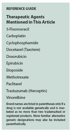 In US Oncology trial 9735, 1016 relatively unselected patients were randomly assigned to receive either doxorubicin, 60 mg/m2, plus cyclophosphamide, 600 mg/m2, (AC) or docetaxel (Taxotere), 75 mg/m2, plus cyclophosphamide, 600 mg/m2 (DC) (Table 2).[7, 8] The duration of therapy in the two arms was identical. After a median follow-up of 7 years, the disease-free and overall survival of patients treated with the DC combination were significantly better than for those treated with AC. One patient in the AC arm died without relapse but with cardiomyopathy and congestive heart failure thought to be related to her exposure to doxorubicin.[8] Significantly more patients in the AC arm had nausea and vomiting (Table 2). Significantly more patients in the DC arm had arthralgia, myalgia, and edema. Neutropenia and febrile neutropenia also occurred more frequently with DC, especially among women aged 65 or over. The incidence of neurotoxicity was not reported but may have been subsumed under the category “myalgia” and “arthralgia.” One older woman died of myelodysplasia and another of myelofibrosis. Neither of these women had relapsed, and the investigators thought their deaths were “probably related to treatment” with AC.