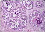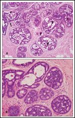 Atypical ductal hyperplasia (ADH) is the most important entity included in the differential diagnosis for low-grade DCIS. ADH has histologic and molecular features that are similar to those of DCIS, but its natural history and therapeutic implications are quite different. ADH is associated with a bilateral increased risk of later cancer development (verified by several large epidemiologic studies) that is four to five times higher than that in age-matched controls.[1-4] This contrasts sharply with DCIS, a nonobligate local precursor for which subsequent risk is localized to the same breast and same site as the index DCIS.[5-7] Although establishing the diagnosis of DCIS is usually straightforward, distinguishing small, low-grade DCIS lesions from ADH can occasionally be difficult; however, this difficulty has recently been exaggerated.[8] In general practice, when strict epidemiologically validated criteria are followed, pathologists are able to accurately diagnose DCIS and can easily make this important distinction (Figure 1).[9] For the uncommon but clearly acknowledged borderline cases, a conservative diagnostic stance is favored to assure that the patient is not overtreated.