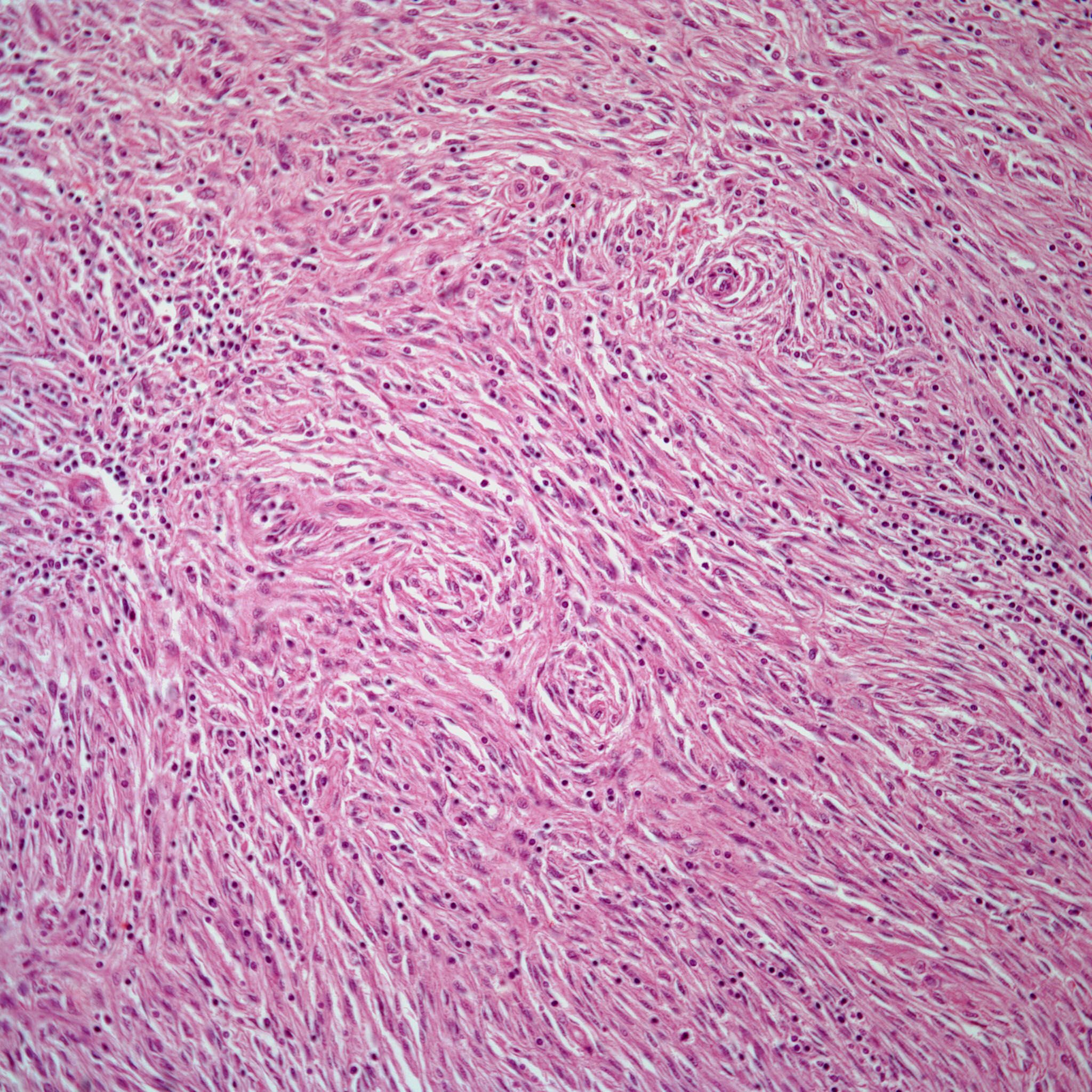 A 45-year-old woman presents with a lesion in the right side of her back. The lesion does not appear to be in soft tissue without involvement of epidermis. Surgical resection of the mass is performed.