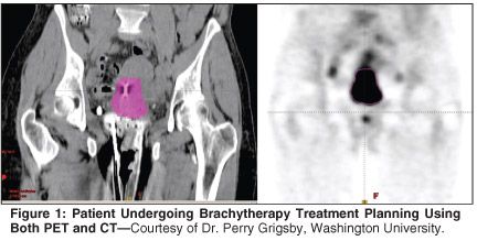 More recently, MRI and PET have shown promise in defining tumor volumes for brachytherapy planning. The use of PET in brachytherapy treatment planning has been pioneered by investigators at Washington University.[57] The hypothesis behind this approach is that functional imaging provides a distinct advantage over anatomic imaging in delineating tumor from critical structures (Figure 1). A significant advantage of this method is that standard applicators can be used with PET. This approach has been shown to be feasible without considerably increasing the time spent in treatment planning.