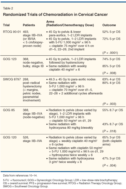 Investigators attempted to improve upon these results with the addition of chemotherapy. Early studies examined the role of neoadjuvant chemotherapy followed by radiation. Unfortunately this treatment did not translate into an improvement in cure rates. In fact, one study even showed decreased overall survival.[4-10] Preliminary studies of concurrent chemoradiation (chemotherapy and radiation given simultaneously) demonstrated more promise and led to several US phase III trials (Table 2).[11-15] These studies demonstrated between a 30% and 50% survival benefit for concurrent cisplatin-based chemoradiation in locally advanced cervical cancer.