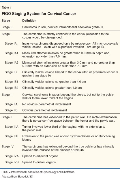 The management of patients diagnosed with cervical cancer is determined foremost by clinical stage at presentation, using the International Federation of Gynecology and Obstetrics (FIGO) staging system (Table 1). Surgery is commonly recommended for the definitive management of patients presenting with stage IA disease. The risk of recurrence following curative surgery for patients with stage IA disease is less than 1%.[2] The procedure consists of an extrafascial hysterectomy for stage IA1 disease or radical hysterectomy with pelvic lymph node dissection and possible para-aortic lymph node sampling for stage IA2 and higher. Patients with stage IA1 disease who are not surgical candidates or who desire to preserve fertility may be managed with a cone biopsy alone if negative margins can be obtained.