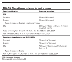Several different regimens, including FAMTX (5-FU, doxorubicin, and methotrexate) and ELF (etoposide, leucovorin, and 5-FU), have been tested. Most regimens show markedly better response rates and longer survival in early trials than in phase III studies. No combination has been confirmed as superior. However, ECF (epirubicin, cisplatin, 5-FU) approaches standard of care in Canada and in some parts of Europe. This regimen has proved superior to FAMTX in terms of objective response rate and survival and superior to the mitomycin, cisplatin, 5-FU (MCF) regimen in terms of toxicity. A combination of docetaxel, cisplatin, and 5-FU was shown to offer superior survival rates vs cisplatin and 5-FU; however, grade 3/4 toxic events occurred in 81% of patients treated with triple therapy. Modifications of this regimen have been proposed and await further testing. The search for the optimal combination regimen continues, with the promising newer agents usually being introduced in combination regimens.