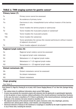 As this Handbook went to press the American Joint Committee on Cancer (AJCC) published an updated edition of the AJCC Cancer Staging Manual. Changes were made to the staging system for gastric cancer. These included the following: T and N categories were modified; stage groupings were changed; Esophagogastric junction tumors or tumors less than or equal to 5 cm from the esophagogastric junction and crossing into the esophagogastric junction are staged using the TNM system for esophageal adenocarcinoma. For additional information see Edge SB et al: AJCC Cancer Staging Manual, 7th edition, chapter 11. Springer-Verlag, New York, 2010. Watch also for updates online at www.cancernetwork.com/cancer-management.