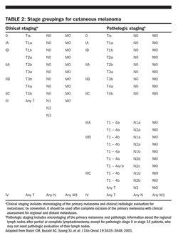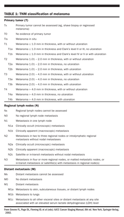 Clinical and pathologic staging TNM staging system The melanoma staging committee of the American Joint Committee on Cancer (AJCC) revised the TNM staging system to reflect more accurately the impact of statistically significant prognostic factors that were validated on a multi-institution sample of over 17,000 melanoma patients. This new system is shown in Tables 1 and 2.