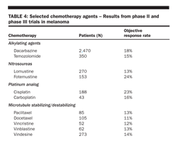 patients on either arm experienced complete responses. The highest response rates have been observed with alkylating agents, platinum analog, and mictrotubule interactive drugs (Table 4). The reference standard to which novel agents and regimens are compared is dacarbazine. In the majority of trials, dacarbazine was administered IV at daily doses of 200 mg/m2 for 5 days every 3 or 4 weeks; however, 1,000 mg/m2 once every 3 or 4 weeks has been given in recent trials. The most common toxicities are myelosuppression and nausea. The severity of myelosuppression rarely requires the use of growth factor support, and the advent of potent antiemetics in recent years has significantly improved the tolerability of this agent. In the largest phase III trial that included a single-agent dacarbazine arm, the objective response rate was 3.5%, and the median progression-free survival was 1.5 months. Overall survival for dacarbazine-treated patients is 6 to 9 months and does not clearly differ from the natural history of metastatic melanoma. Fotemustine, a nitrosourea with modestly superior activity compared with dacarbazine, is available for clinical use in Europe but not in the United States.