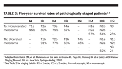 aggressive than a similar melanoma that penetrates the reticular dermis in an area where the skin is thinner. Despite this, Clark’s level remains of prognostic value for patients with melanoma less than or equal to 1 mm in depth and is incorporated into the staging system for these lesions (Table 1).