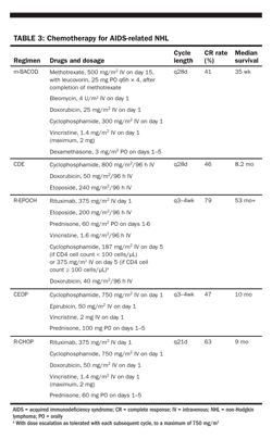Re A, Michieli M, Casari S, et al: High-dose therapy and autologous peripheral blood stem cell transplantation as salvage treatment for AIDS-related lymphoma: Long-term results of the Italian Cooperative Group on AIDS and Tumors (GICAT) study with analysis of prognostic factors. Blood 114:1306â1313, 2009.