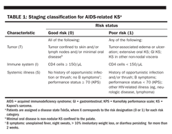 the ACTG. This system segregates patients into good or poor prognostic groups based on tumor characteristics, immune system function, and systemic illness (the tumor-immune system-systemic illness [TIS] system; see Table 1). A retrospective analysis of 294 patients with AIDS-related KS has shown that the TIS system is a valid predictor for survival.