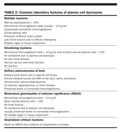 Features of low tumor mass are usually present, without renal disease, hypercalcemia, or lytic bone lesions (Table 2). Marrow plasma cytosis occurs in less than 30% of patients, and anemia, if present, is mild (hemoglobin value > 10.5 g/dL).