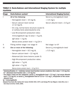 is begun. These two systems are compared in Table 3. The Durie-Salmon staging system better provides information on tumor burden, whereas the ISS staging system better serves as a prognostic indicator. The ISS is easier to use, and it classifies patients correctly regardless of their geographic origin (ie, North America, Europe, or Asia), age (ie, ≥ 65 years vs younger age), or type of treatment (ie, conventional chemotherapy vs high-dose therapy followed by autologous stem cell transplantation). More recent studies have provided evidence that the ISS is reliable in patients managed with thalidomide (Thalomid), bortezomib (Velcade), or lenalidomide (Revlimid).