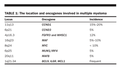 Karyotypic abnormalities in myeloma are complex, with both numeric and structural abnormalities. DNA aneuploidy is observed in more than 90%; these are predominantly hyperdiploid, with less than 10% being hypodiploid, and carry a poor prognosis. Recurrent nonrandom structural abnormalities have been identified and linked to the pathogenesis and prognosis of myeloma. The immunoglobulin (Ig) heavy-chain gene at 14q32 is frequently involved in translocations with partner chromosomes 4, 6, 8, 11, and 16. The location and oncogenes involved are shown in Table 1. Translocations involving chromosomes 4 and 16 as well as del17p13 (TP53) have been associated with a poor prognosis. Del13q or monosomy 13 is observed in 15% to 20% of patients with conventional cytogenetics and also carries a poor prognosis across standard and high-dose therapies. Interphase fluorescence in situ hybridization (FISH) with a specific probe for chromosome 13q34 (retinoblastoma gene, [RB1]) identifies this abnormality in up to 50% of patients, with a less clear prognostic implication.