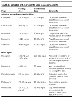 Selected antidepressants used in cancer patients are listed in Table 1. No antidepressant has been shown to be more effective than any other in the cancer setting. Often, the choice of an antidepressant is based on side-effect profile.