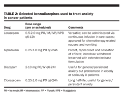 Benzodiazepines Because of the delayed onset of antidepressant action, benzodia-zepines are often useful adjuncts to initial treatment. These medications have variable hypnotic, antiemetic, and muscle-relaxant effects useful in other aspects of supportive cancer care. Caution is required when using these agents in the settings of serious illness (because of the risk of additive sedation with other medications), advanced age, or CNS impairment (because of the risk of disinhibition or delirium). Benzodiazepines commonly used to treat anxiety in cancer patients are listed in Table 2.