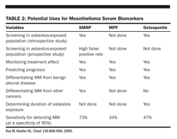 Small retrospective series have studied three biomarkers: soluble mesothelin related peptide (SMRP), megakaryocyte potentiation factor (MPF), and osteopontin. SMRP may predict the development of mesothelioma in asbestosis-exposed individuals. Prospective studies are required to validate the utility of these biomarkers for early detection, predicting the extent of disease and determining prognosis.