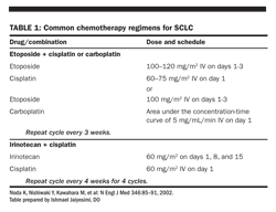 The combination of cisplatin or carboplatin/etoposide (see Table 1 for common dose ranges) is considered the standard of care in the United States at this time. This standard is primarily based on therapeutic index, as randomized trials have not demonstrated a survival benefit for this combination relative to the older regimen of cyclophosphamide, doxorubicin, and vincristine. The regimen is repeated at 3-week intervals for 4 to 6 courses. In North America, multiple randomized trials of newer cytotoxins replacing etoposide in a doublet with cisplatin, or added to the etoposide/platin base, have not provided a survival benefit. Japanese data that showed a 3.4-month survival advantage for irinotecan, as opposed to etoposide, with cisplatin were not confirmed in a trial in the United States.