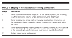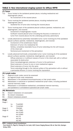 The IMIG has developed a staging system based on TNM descriptors. This was adopted by the American Joint Committee on Cancer (Table 3). Another commonly utilized staging system for mesothelioma, that of Butchart, is based on inexact descriptions of the extent of local tumor growth or distant metastases (Table 4). Other, more detailed staging systems based on TNM criteria have been proposed.