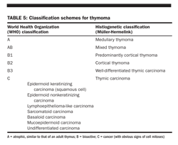 Two of the most common classification schemes for thymoma are listed in Table 5. Verley and Hollman propose a classification system based on tumor architecture, cellular differentiation, and predominant cell type. Bernatz et al describe a simpler classification by presenting thymoma based on the percentage of epithelial cells and lymphocytes. In both of these systems, thymoma with a predominance of epithelial cells is associated with a greater incidence of invasion and a subsequently worse prognosis.