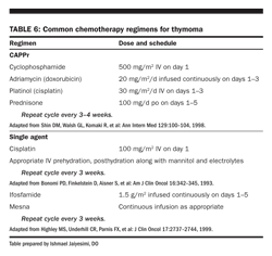 Chemotherapy Chemotherapy has been used in the treatment of invasive thymomas with increasing frequency during the past decade (Table 6). The most active agents appear to be cisplatin, doxorubicin, ifosfamide, and corticosteroids. Combination chemotherapy has generally shown higher response rates and has been used in both neoadjuvant and adjuvant settings and in the treatment of metastatic or recurrent thymomas. CAP or CAPPr (cyclophosphamide, Adriamycin [doxorubicin], Platinol [cisplatin], and prednisone) regimens have been used in neoadjuvant and/or adjuvant settings. These regimens have also been used for recurrent thymoma.