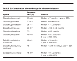 However, the primary route of investigation for these new agents has been in combination with cisplatin and/or 5-FU. The results available to date suggest promising activity, with response rates often around 50% in phase II studies. Irinotecan (65 mg/m2) and cisplatin (30 mg/m2) administered weekly for 4 weeks every 6 weeks have also been active, with responses in 20 of 35 patients (57%) and an impressive median survival of 14.6 months. A Korean phase II study did not confirm these results but did suggest the combination was active, with a response rate of 31% of 32 patients, and a median survival of 9.6 months.