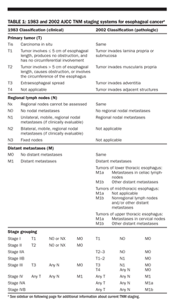 As this Handbook went to press the American Joint Committee on Cancer (AJCC) published an updated edition of the AJCC Cancer Staging Manual. Changes were made to the staging system for esophageal cancer. These included the following: Redefinition of Tis, N, and M; Subclassification of T4 and N; separate stage groupings for squamous cell carcinoma and adenocarcinoma; reassignment of stage groupings using T, N, M, and G classifications. For additional information see Edge SB et al: AJCC Cancer Staging Manual, 7th edition, chapter 10. Springer-Verlag, New York, 2010. Watch also for updates online at