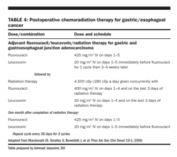Oxaliplatin may also have a role in the treatment of esophageal cancer, both as a radiosensitizer and an agent in advanced disease. Mauer and colleagues reported the results of treatment with oxaliplatin, 5-FU, and leucovorin according to the FOLFOX4 schedule (oxaliplatin, 85 mg/m2 on day 1; leucovorin, 500 mg/m2 over 2 hours on days 1 and 2; and 5-FU, 400 mg/m2 bolus, then 600 mg/m2 over 22 hours on days 1 and 2, repeated every 14 days). Of 35 patients who were treated, objective responses were noted in 40%. The median survival rate was 7.1 months, the 1-year survival rate was 31%, and the 2-year survival rate was 11%. The median progression-free survival was 4.6 months. Although differences in patient populations were noted, these results are similar to those of other reported combinations.