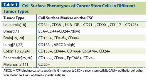 Table 1: Cell Surface Phenotypes of Cancer Stem Cells in Different Tumor Types