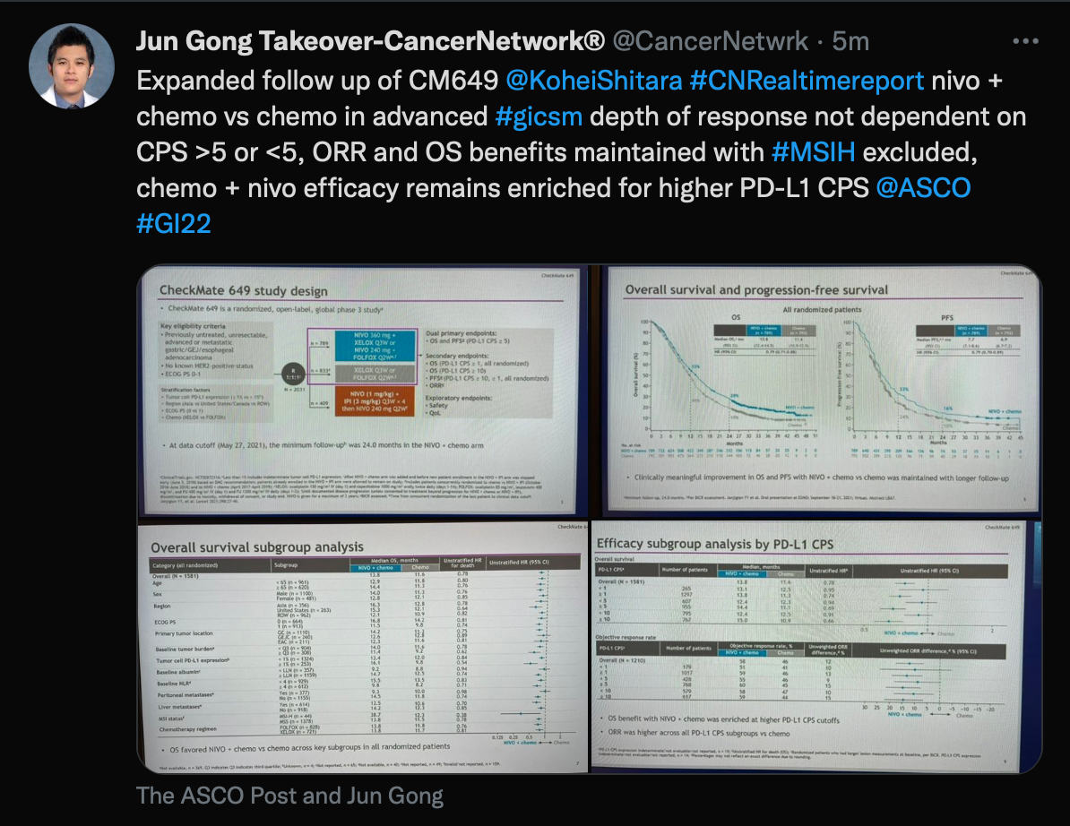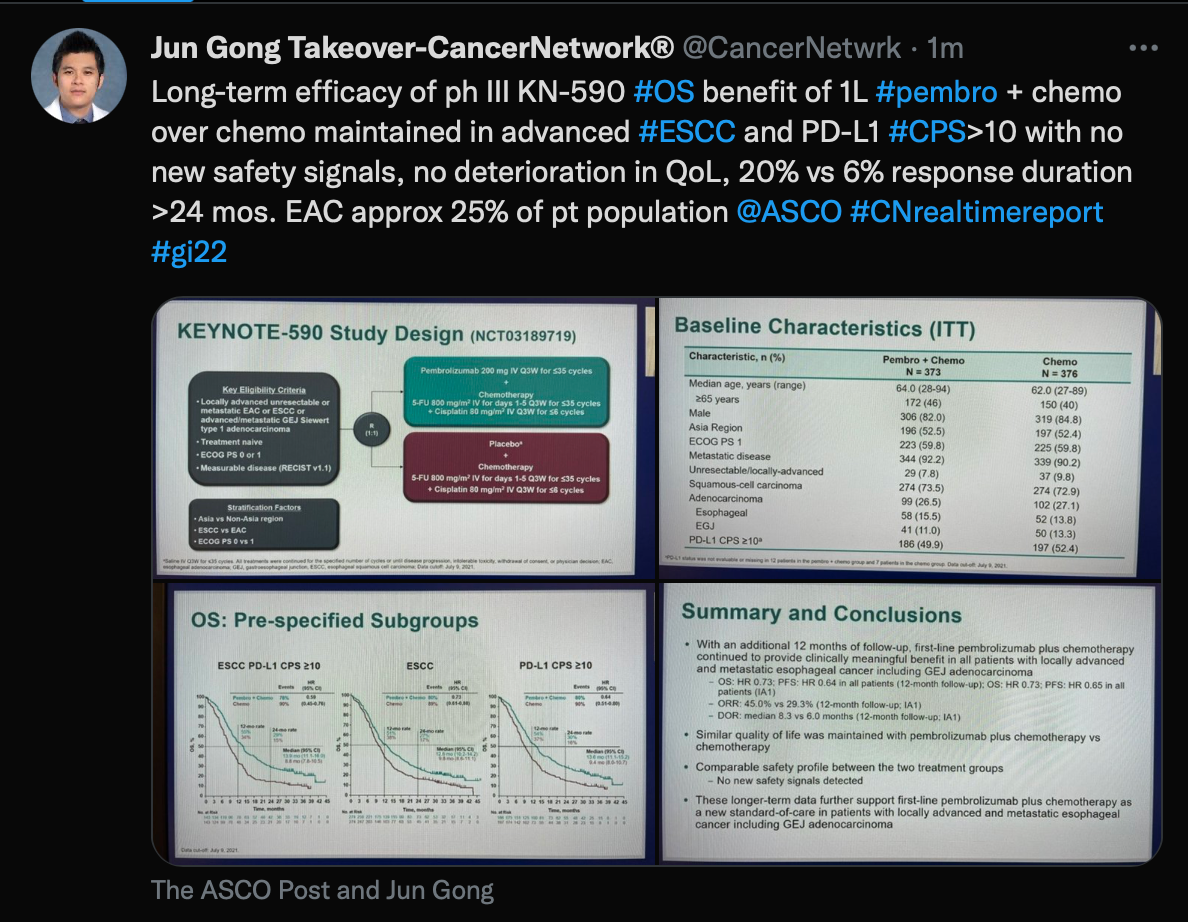 Jun Gong, MD, hosted a Twitter takeover during the 2022 Gastrointestinal Cancers Symposium where he discussed breaking presentations in a #CNRealtimeReport.