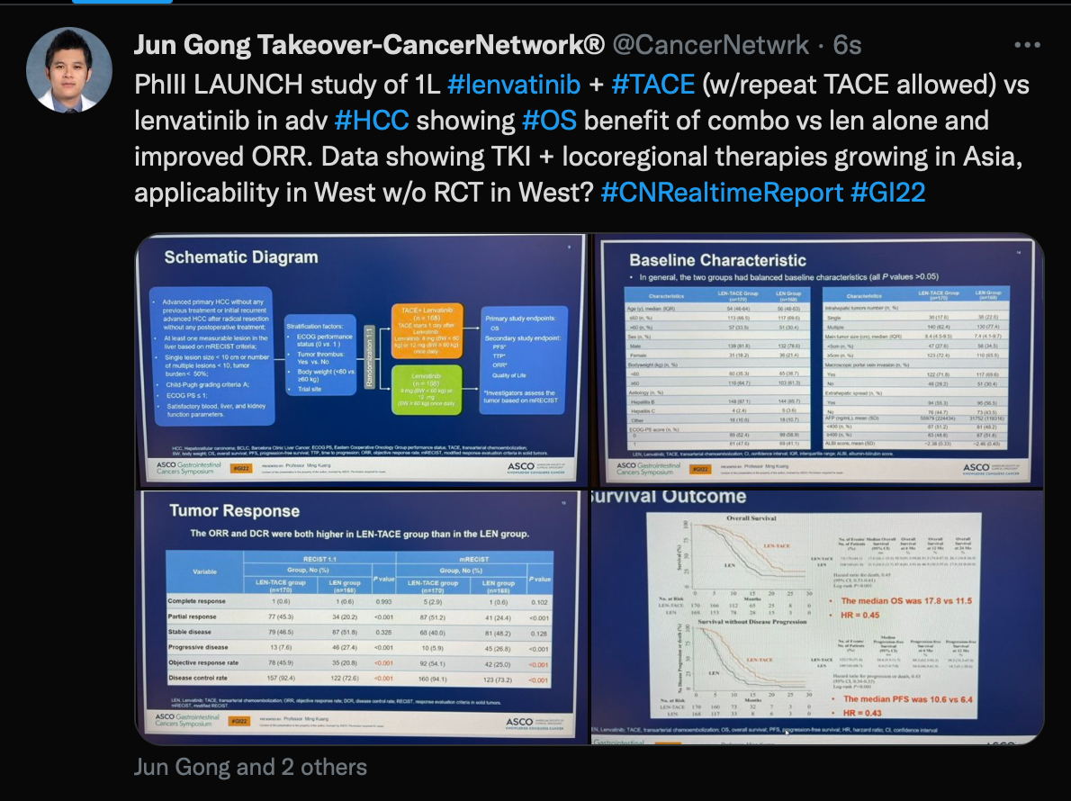 An important study Gong discussed was the phase 3 LAUNCH trial (NCT03905967) examining lenvatinib (Lenvima) plus transarterial chemoembolization (TACE) or lenvatinib monotherapy. “1L #lenvatinib + #TACE (w/repeat TACE allowed) vs lenvatinib in adv #HCC showing #OS benefit of combo vs len alone and improved ORR,” he wrote.