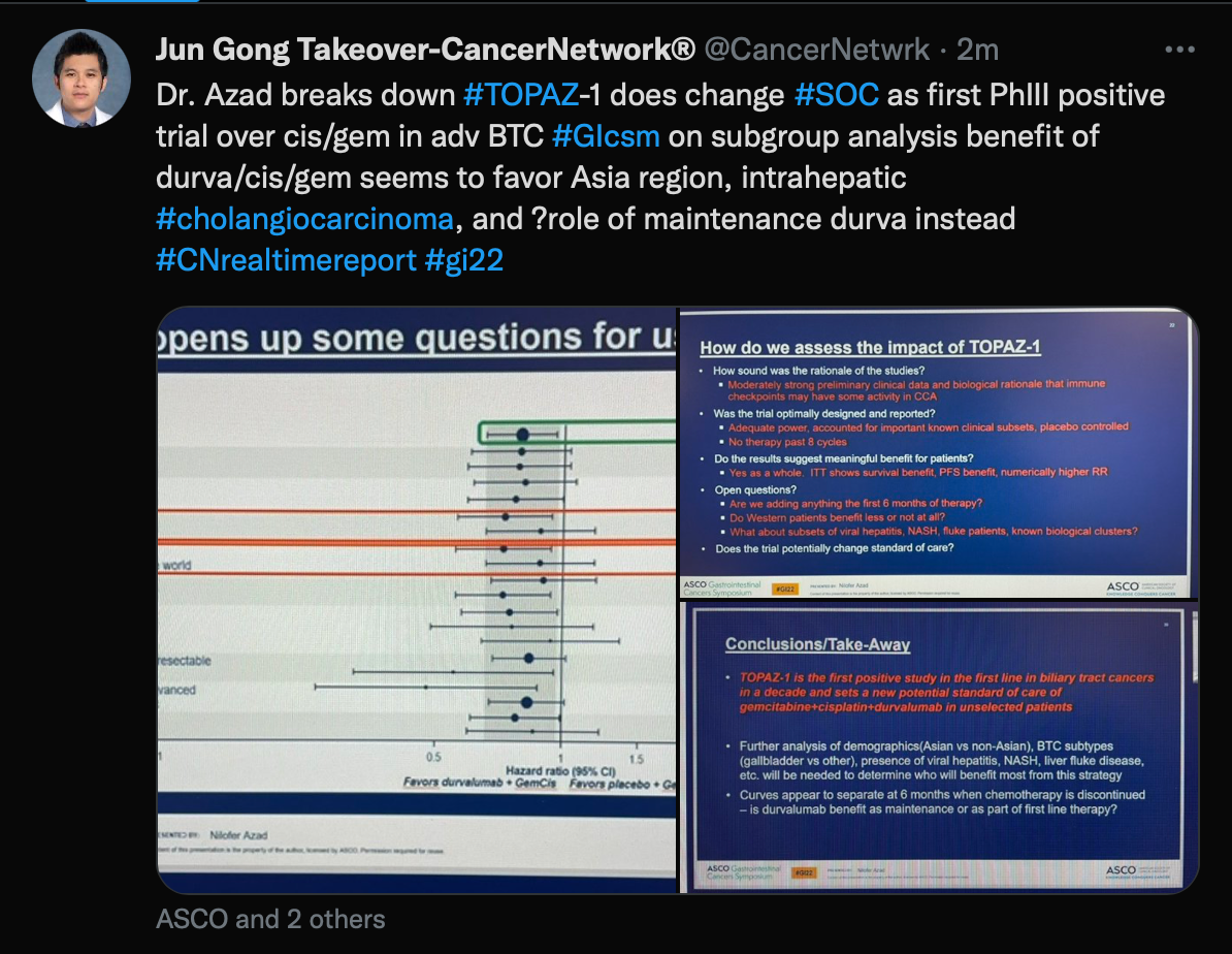 Gong wrote, “Dr. Azad breaks down #TOPAZ-1 does change #SOC as first PhIII positive trial over cis/gem in adv BTC…”