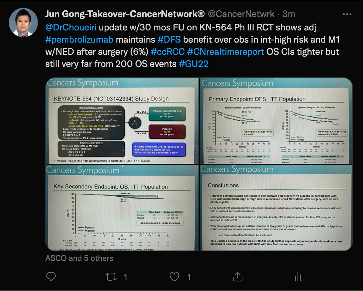 Finally, Gong spoke about an updated analysis of the KEYNOTE-564 trial (NCT03142334) which was presented by Toni K. Choueiri, MD, director of the Lank Center for Genitourinary Oncology at Dana-Farber Cancer Institute and Jerome and Nancy Kohlberg Chair and Professor of Medicine at Harvard Medical School in Boston, Massachusetts.