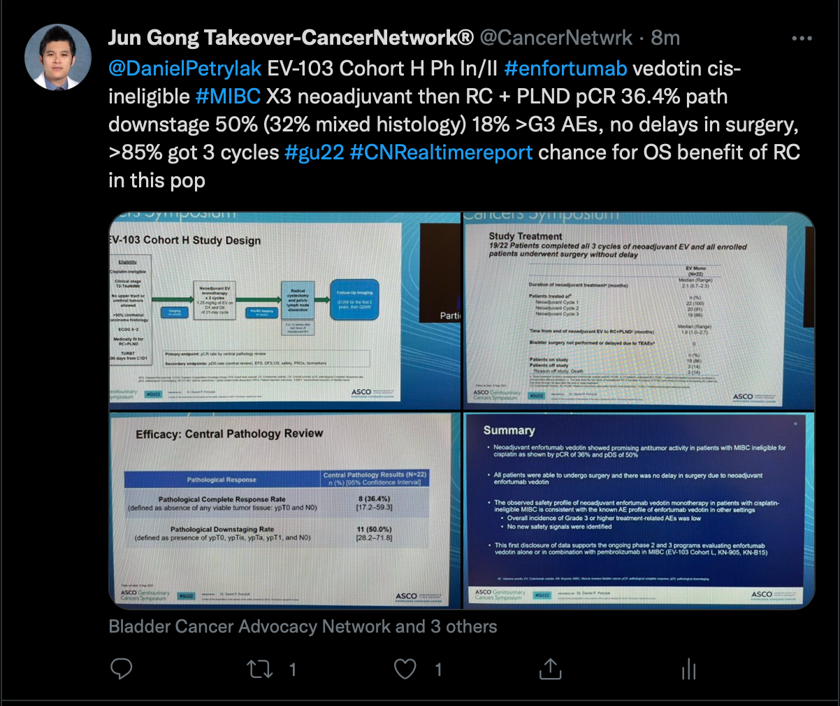 Next, Gong discussed a presentation from the phase 1b/2 EV-103 study (NCT02388545) which examined data from a cohort of patients with muscle-invasive bladder cancer who were treated with neoadjuvant enfortumab vedotin (Padcev) in the setting of cisplatin ineligibility.