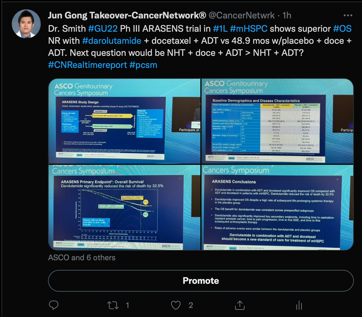 Gong began the takeover by discussing the ARASENS trial (NCT02799602), which included men with metastatic castration-sensitive prostate cancer who were treated with androgen deprivation therapy (ADT) and docetaxel with or without darolautamide (Nubequa).